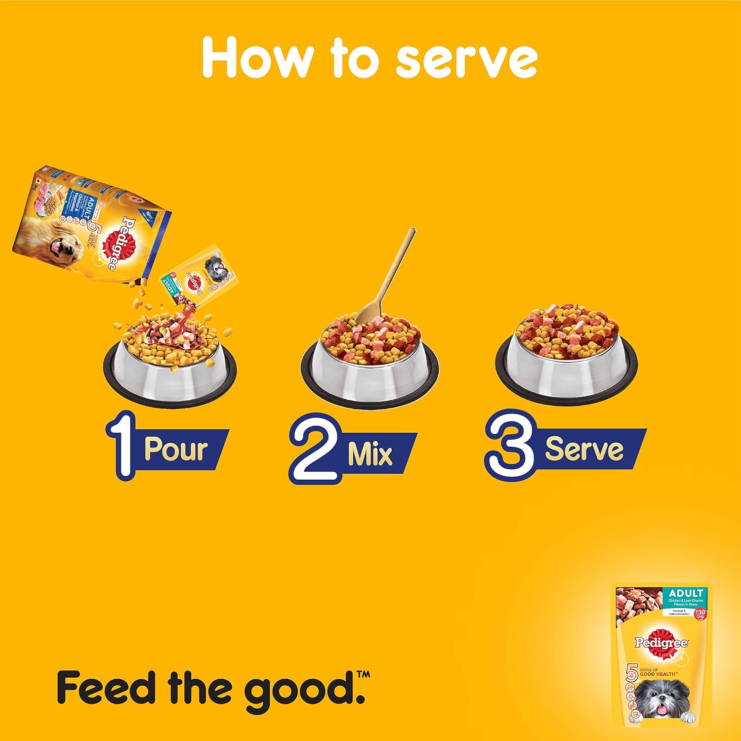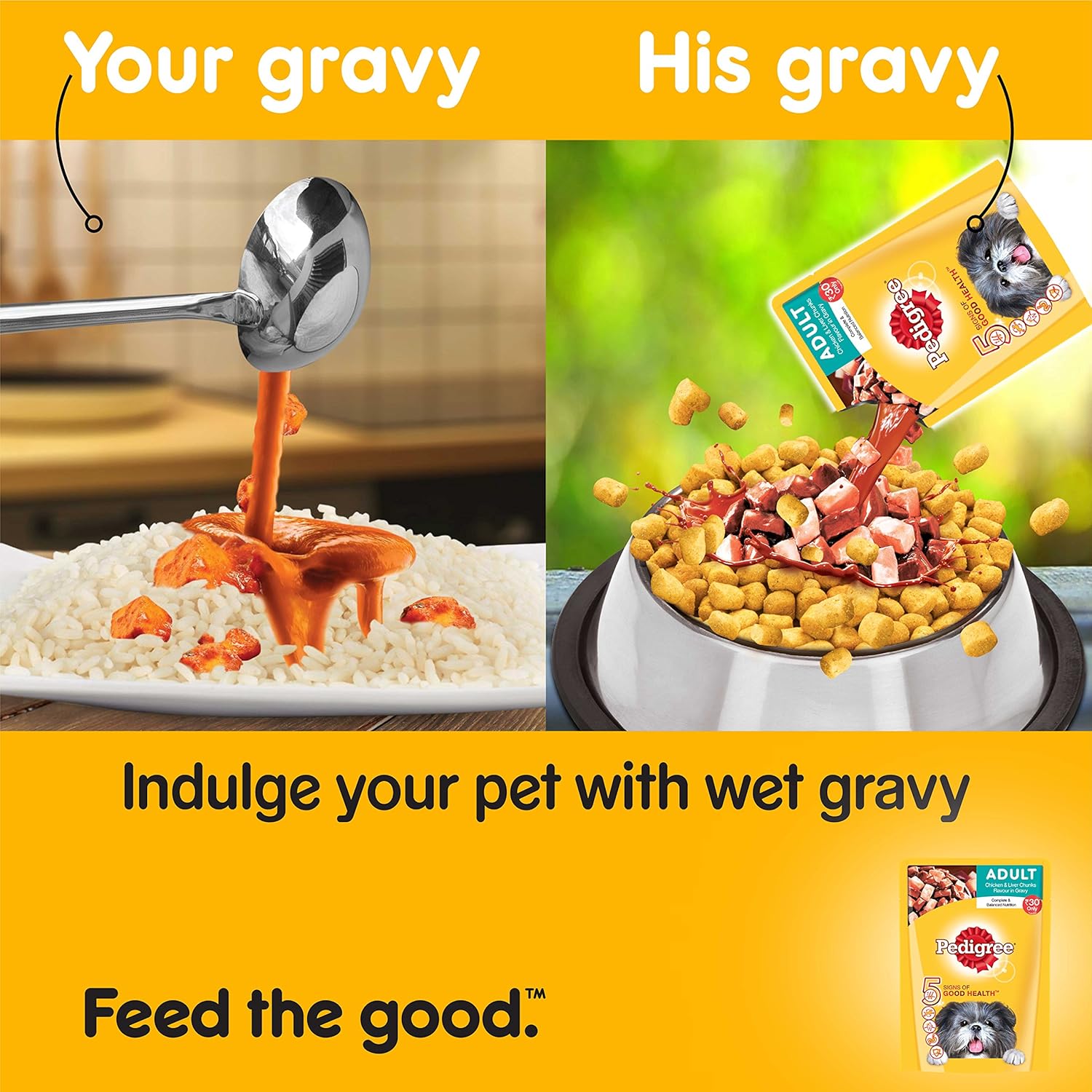 Pedigree Gravy is a nutritious and balanced food for your pet dog. Made with high-quality ingredients, Pedigree provides dogs the 5 Signs of Good Health – healthy skin and coat, strong bones and teeth, healthy digestive system, strong muscles, and a stronger immune system. Containing a higher moisture content, Pedigree gravy food pouches are especially required for the hot season as they help keep your pooch hydrated and therefore, energetic. It can be mixed with any meal - Pedigree dry food or home cooked food - to enhance taste and improve moisture-content. The tempting aroma and flavor of wet dog food are also effective in attracting fussy eaters into eating their meal.